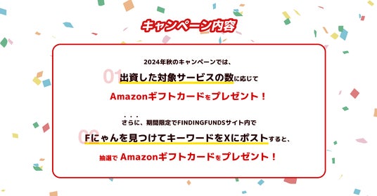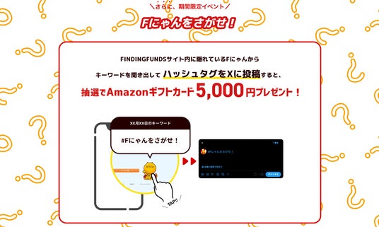 さらに、今回は期間限定で、ファインディングファンド内でキーワードを探し出し、X(旧Twitter)にポストした人の中から抽選でAmazonギフトをプレゼントする「Fにゃんを探せ!キャンペーン」も開催します。