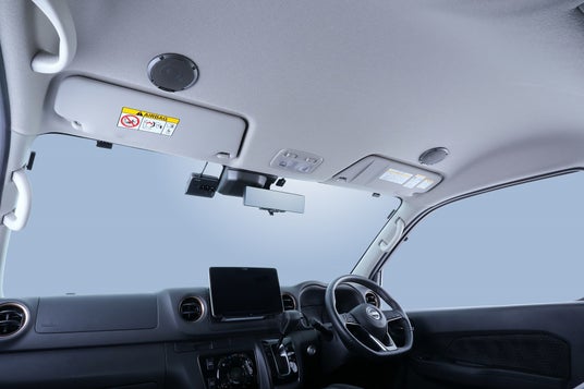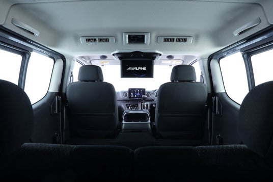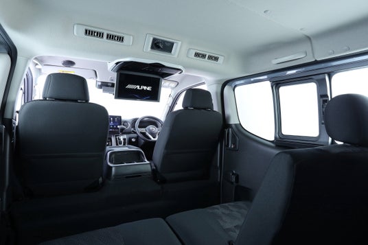 キャラバン専用の天井吊り下げ型リアビジョン(後席モニター)取付けキットが登場。12.8型の大画面リアビジョンを装着することができます。