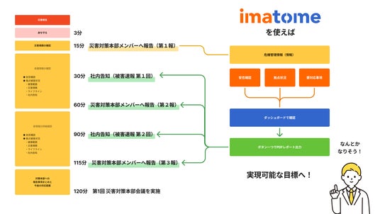 危機管理情報サービスを提供する株式会社レスキューナウ(本社:東京都品川区、代表取締役:朝倉一昌、以下「レスキューナウ」)は、オールインワンBCPツール「imatome(イマトメ)」において、災害対応時に自社の対応進捗状況を自動集約し、ダッシュボード上に可視化した内容をレポート形式でまとめて出力することができる新機能「レポート機能」を2025年5月12日にリリースします。本機能は、既存市場において類似事例の網羅的な調査を行っていない段階ではありますが、レスキューナウ独自の視点でユーザー課題に着目し、企画開発を進めてきたものです。