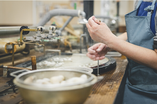 「宮坂製糸所」では、煮繭で機械を用いず、手で挽き出して糸を繰る「手挽き」を行っています。