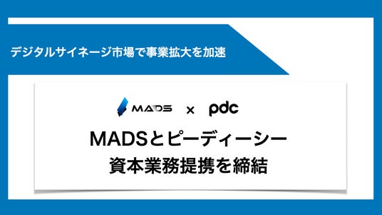 デジタルOOHアドネットワーク事業およびCMS開発・運用事業を行う、株式会社MADS(東京都渋谷区 代表取締役:穴原 誠一郎、以下「当社」)は、デジタルサイネージソリューション事業、コンテンツ配信事業を行うピーディーシー株式会社(本社:港区、代表取締役社長 田中 真吾、以下「PDC」)と資本業務提携をしたことをお知らせします。