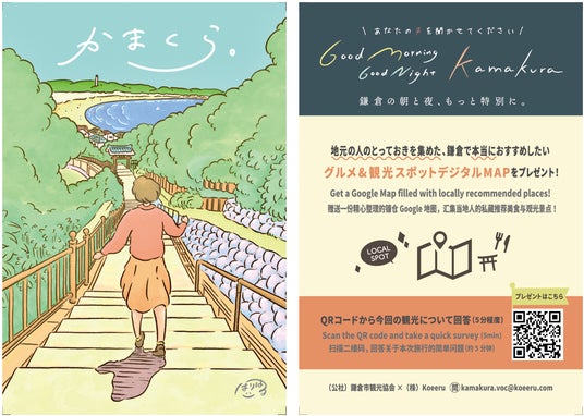 アンケート回答者には、地元の人がおススメしたい飲食店や訪問場所をコメント付きでまとめたGoogle Maps 「とっておきの鎌倉観光情報」を提供します。回答の御礼として、より充実した観光体験を地元の事業者がサポートする仕組みとなっています。