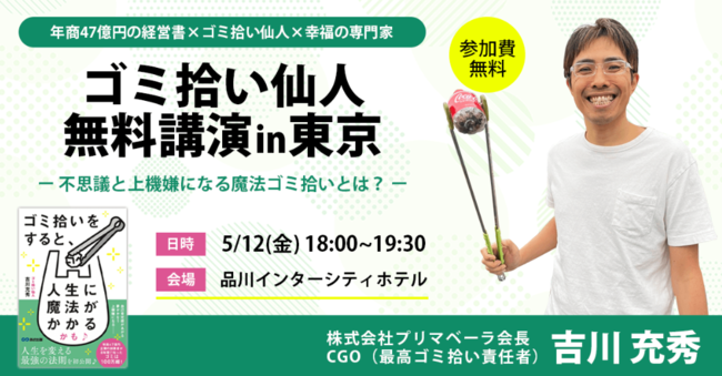 北関東を中心にリユース事業など、4事業部57拠点でグループ年商約47億円の株式会社プリマベーラ(群馬県太田市/代表 吉川充秀)が、「ゴミ拾い仙人 無料講演in東京」を5月12日(金)に東京で開催することが決定しました。地元太田市で3月21日(火)に開催した「ゴミ拾い仙人 出版記念講演イベント」の参加者が、目標の30名を越える53名と好評だったため東京での開催し、さらに多くの人に発信します。