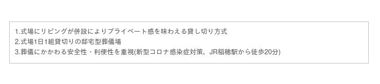 さらに、この式場においては「ご遺族様が安心して故人とのお別れの時を過ごせるよう」、お客様によりそったサービスを展開してまいります。