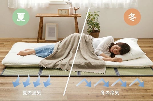 この畳マットレスは、樹脂パイプで出来ているため水分や汚れに強く、カビが発生しにくくなっています。またストローのような中空パイプ材を使うことで、夏は肌との接地面積が少なく湿気がこもりにくいので涼しく、冬はパイプの中の空気の層が床からの冷気を防いでくれるので暖か。年中快適に過ごせます。