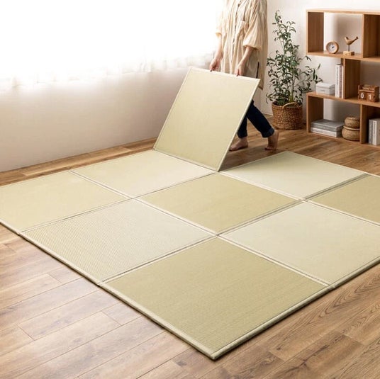 広げると約4.5畳(約225×225cm)の大きさになる9枚連結畳は、9枚の置き畳を連結したことで1枚1枚の隙間をなくし、綺麗に敷くことができる置き畳です。使わない時は折り畳んでコンパクト(約150×75cm)に収納出来ます。