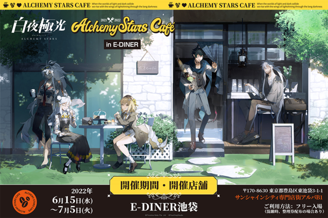 『白夜極光』と池袋E-DINERがコラボレーション。店舗では『白夜極光』の世界観やキャラクターをイメージした、ここだけのコラボメニューはもちろん、メニューを注文すると貰えるオリジナル特典もアリ!