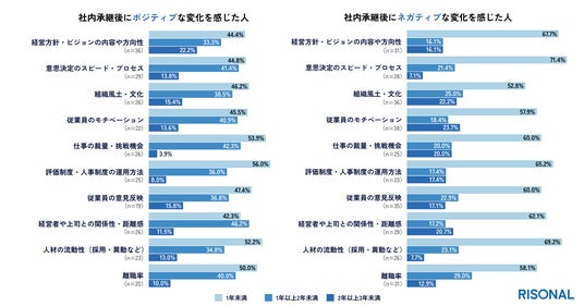 ・社内承継後の変化、ポジティブ・ネガティブ共に1年未満に集中