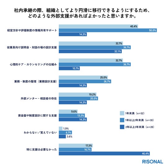 一方、承継から2年以上3年未満の層では「特に支援は必要なかった」が46.4%と突出しており、時間の経過とともに社内の状況が落ち着き、不安の解消や自走が進んでいる様子がうかがえます。