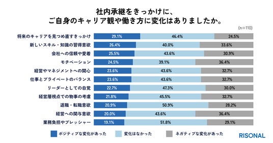 社内承継を経て自身のキャリア観や働き方に変化があったかを尋ねたところ、いずれの項目でも「変化はなかった」が約4割と最多となりました。一方で、約3割が「将来のキャリアを見つめ直すきっかけ」と回答しており、ポジティブな変化も一定数みられました。