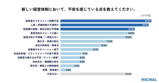 新しい経営体制に対して感じている不安を尋ねたところ、「経営者のマネジメント経験不足」が30.0%で最も多く、「人事・評価制度の不透明さ」が29.1%、「経営陣の役割・責任分担が不明確」が24.5%と続きました(n=110)。