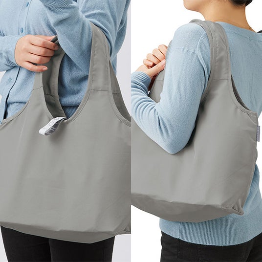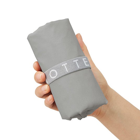 「MOTTERU」シリーズ最大の特徴である、くるりと丸めてゴムバンドで留めるコンパクト収納も健在です。サブバッグとしてカバンの中に常備しておいても邪魔になりません。