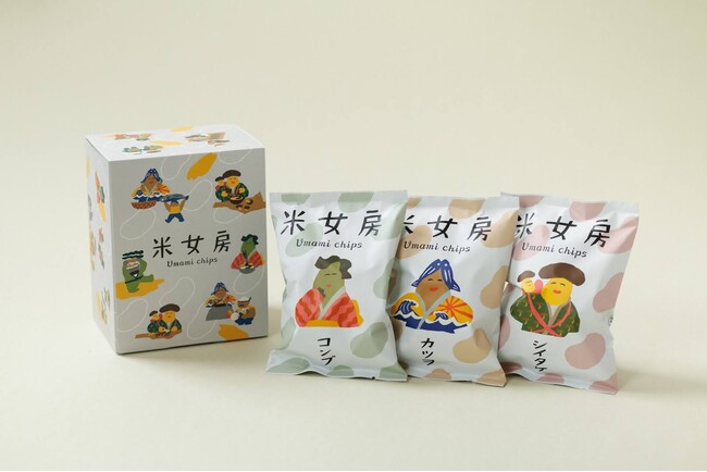 上品で控えめな旨味の持ち主の昆布出汁、豊かな風味と旨味が詰まった鰹出汁、芳ばしく香り高い椎茸出汁。一つひとつ表情の違う3種類のお出汁の旨味をぎゅっと凝縮し、お米本来の豊かな甘味と掛け合わさることで、「米女房 Umami chips」は、新感覚な米菓でありながらも、ずっと親しまれて続けてきた、でもどこか懐かしさも感じられる、そんな新しいお米のチップスとして完成しました。