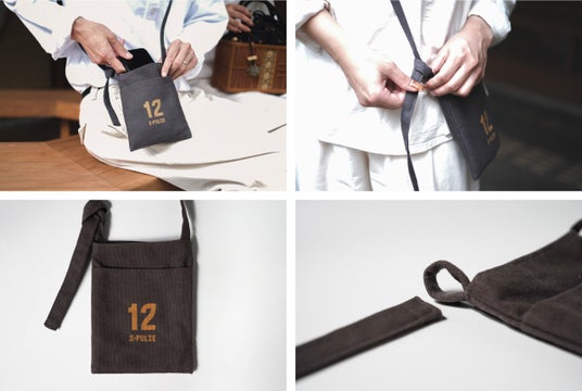 お茶で染めた「お茶染め」のサコッシュ。お茶染めのシンプルな色合いにサポーター番号「12」のデザイン。前面にはポケット付き、ひもの結び方で長さが調整できる。スタジアムから日常まで万能に活用いただける。