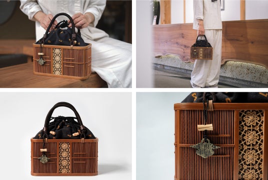 国指定の静岡を代表する伝統的工芸品「駿河竹千筋細工」の手提げバッグ(静岡竹工芸協同組合・みやび行燈製作所)。竹を丸く細く整えるひごづくりや組み立て、枠となる竹の精巧な継ぎ手など、静岡でしかできない技法がつまっている。このバッグの巾着部分にはエスパルスデザインの「お茶染め」のオリジナル巾着を使用(染色・鷲巣恭一郎)。駿河漆器のパルちゃんチャーム付(漆芸・藤中知幸)。静岡の伝統工芸技術が集結したバッグ。