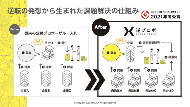株式会社ソーシャル・エックス(本社:東京都渋谷区、代表取締役:伊佐治幸泰・伊藤大貴、以下「ソーシャル・エックス」)が提供する、官民共創による新規事業開発プラットフォーム「逆プロポ」(https://gyaku-propo.com/)が、サービスイノベーショ ンに挑戦している革新的で優れたサービス事例を幅広く選定し公表する、公益財団法人日本生産性本部が主催する“日本のサービスイノベーション2022”に選出されました。本サービスは2022年度グッド・デザイン賞も受賞しています。