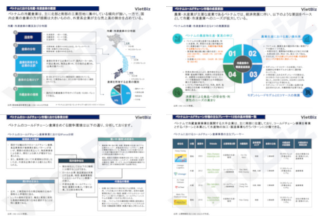 ▶各事業者セクターを網羅的に記載(地場コールドチェーン企業、顧客サイドの食品メーカー及び物流企業、消費者サイド企業) コールドチェーンに関わる事業者セクターの動向を網羅しています。日本からのデスクトップ調査では取得困難な、ベトナム現地企業や有識者へヒアリングしないと取得できない現地情報も含んでおり、コールドチェーン事業展開に関する意思決定に必要な内容を記載しています