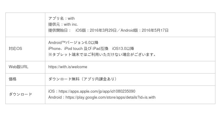 マッチングアプリ『with』は2015年9月にサービスを開始した、主に20代の方に真面目な出会いの場としてご利用いただいている、価値観でマッチング可能な恋活・婚活マッチングアプリです。統計学×心理学により自身に合った最適なパートナーを探せるサービスをめざしており、自分と同じ価値観を持つお相手が見つかる「好みカード」機能や「心理テスト」で深層心理までを含めたマッチングを可能としています。