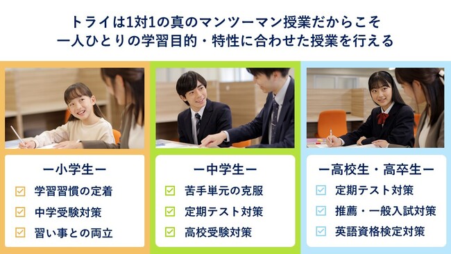 トライは、個別指導の中でも完全1対1型の「真のマンツーマン授業」です。カリキュラムも講師も授業スピードもお子さまの特性に合わせて、個々に最適な勉強法を提示することができます。だからこそ、一人ひとりが目指すゴールへ導くことができます。