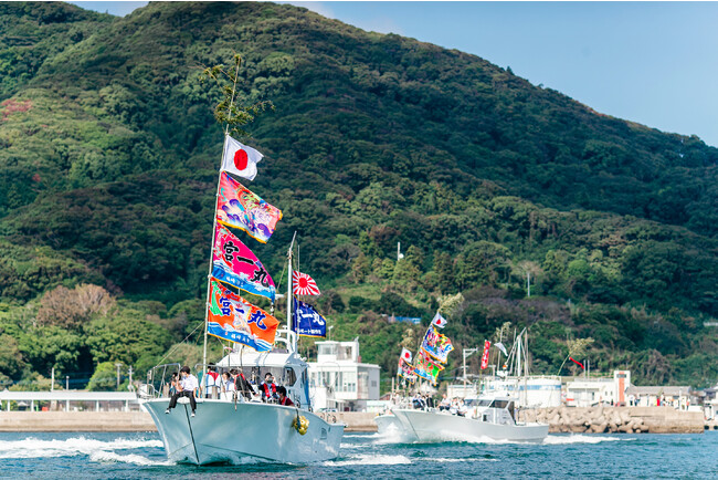 宗像大社「秋季例大祭 」の祭礼の一つで、3年ぶりにフル開催となった「みあれ祭」にて、アーティスティックな大漁旗「MOVE ON」がお披露目。漁船に掲げられて海上を巡航した。