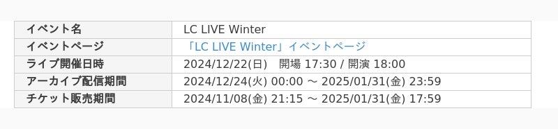 合同会社ライブカートゥーンが主催する、VTuberたちのグループライブ「LC LIVE Winter」が、バーチャルライブ配信プラットフォーム「V-TIPS」のシアターライブ機能を通して、2024年12月22日(日)に開催されます。