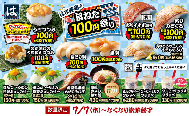 株式会社はま寿司(代表取締役社長:遠藤 哲郎 本社:東京都港区)が展開する100円寿司チェーン「はま寿司」は、7月7日(木)から、はま寿司厳選の旨ねたを特別価格の100円(税込110円)でご提供する「はま寿司の旨ねた100円祭り」を全国の店舗で開催します。ウニやイチボ、のどぐろの他に、暑い夏にぴったりな商品も販売します。