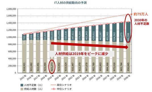 その要因は圧倒的な人材不足と言われており、経済産業省の発表によると若年層の人口減少に伴って、2019年にはIT関連産業への入職者は退職者を下回り、IT人材不足は2030年には80万人規模に達すると予想されています。