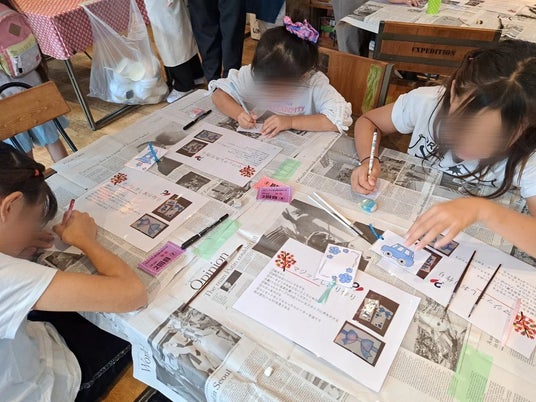 「マジックしおりづくり」は、温めることで色が変わるサーモインクの筆記用具を使って、しおりをつくる子どもたち向けのワークショップです。なぜ色が変わるのか学生が説明をすると、子供たちのみならず保護者の方からも「知らなかった」「勉強になった」などのお声をいただきました。