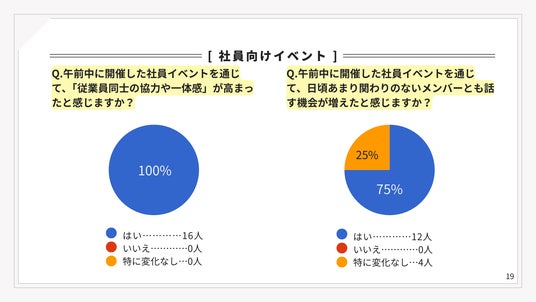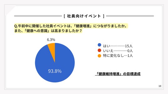 イベント後に実施したアンケートでは、イベントの目的を達成したと判断できる結果を得ることができました。特に、「健康チェックバトル」でおこなった○×クイズでは、問題に対して○だと思うチームは「太ももを10回あげる運動」、×だと思うチームは「かかとを10回あげる運動」など、それぞれ運動とかけあわせたミッションを提示し、白熱した盛り上がりを見せました。