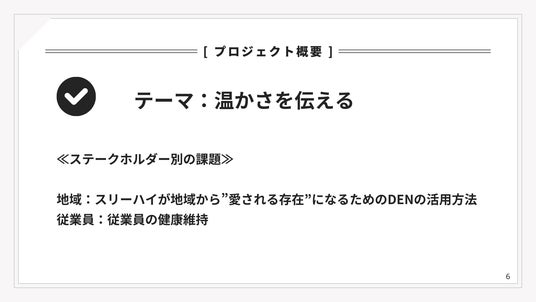 本プロジェクトの目的は、日頃スリーハイがお世話になっている、ステークホルダーに温かさを伝えること