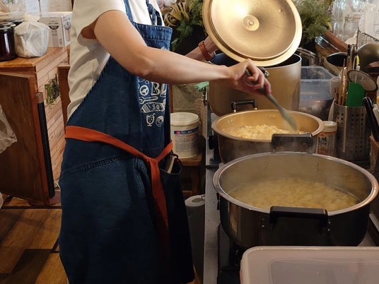 水餃子スープは、スリーハイ本社の近隣に立地する、業務用餃子メーカー(ドラゴンフーズ株式会社)と、東山田の農家さんの協力を得、「水餃子とさつまいものポタージュスープ」を提供しました。レシピ検討にあたっては、同じく東山田で活動するフードコーディネーターの安田さんからアドバイスをいただきながら、こちらも何度も試作を繰り返して本番を迎えました。