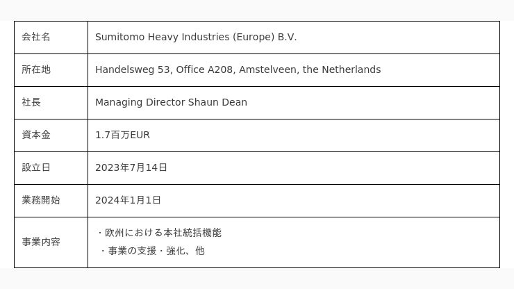 住友重機械工業株式会社(本社:東京都品川区、代表取締役社長:下村真司、以下「当社」)は、オランダ王国に欧州本社統括拠点となるSumitomo Heavy Industries (Europe) B.V.(住友重機械工業100%出資、以下、「新会社」、略称:SHI(Europe))を新たに設立しましたのでお知らせします。