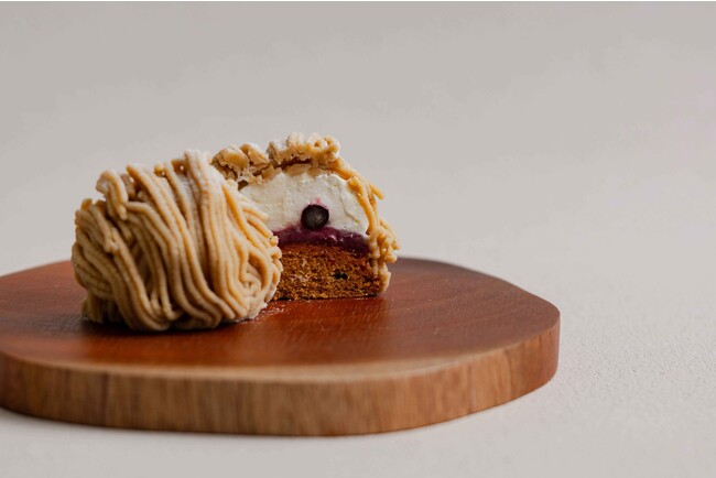 サクサクのメレンゲにカシスとホワイトチョコのカスタードクリーム、カシス、生クリームを重ね、仕上げに熊本県産の和栗を使用したマロンクリームを絞りました。風味豊かな和栗と程よい酸味のカシスが好相性の数量限定モンブラン。