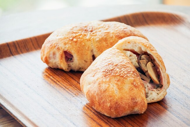 低温長時間発酵フランス生地でガーリックベーコン、マッシュルームを包みチーズ、オリーブオイルで焼き上げました。