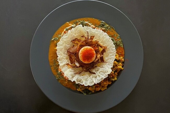 『松阪極豚・錦爽鶏・きのこ・根菜』など秋の味覚がたっぷり入った素材の旨みギッシリのキーマカレーに、定番のまろやかチキンカレーのあいがけです。食感のアクセントや味の変化を楽しめるパリパリのライスペーパーと半熟味玉のせ!