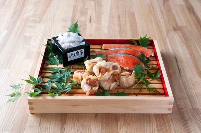 白身魚のすり身でほぐした秋鮭の身を包み込んだ、アツアツ揚げたて天。ポン酢との相性も抜群。
