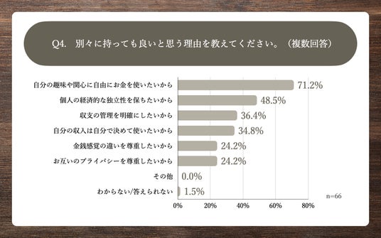 Q3で「財布(お金の管理)」と回答した方に、「Q4.別々に持っても良いと思う理由を教えてください。(複数回答)」(n=66)と質問したところ、「自分の趣味や関心に自由にお金を使いたいから」が71.2%、「個人の経済的な独立性を保ちたいから」が48.5%、「収支の管理を明確にしたいから」が36.4%という回答となりました。