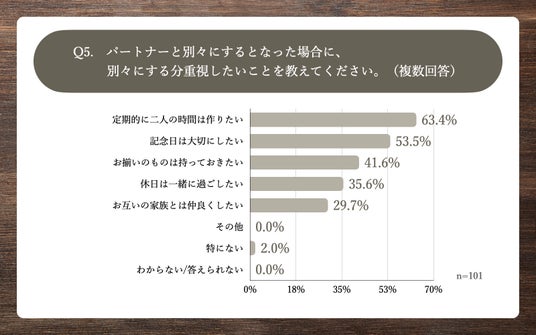 Q3で「特にない」「わからない/答えられない」以外を回答した方に、「Q5.パートナーと別々にするとなった場合に、別々にする分重視したいことを教えてください。(複数回答)」(n=101)と質問したところ、「定期的に二人の時間は作りたい」が63.4%、「記念日は大切にしたい」が53.5%、「お揃いのものは持っておきたい」が41.6%という回答となりました。