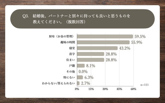 「Q3.結婚後、パートナーと別々に持っても良いと思うものを教えてください。(複数回答)」(n=111)と質問したところ、「財布(お金の管理)」が59.5%、「趣味の時間」が55.9%、「寝室」が43.2%という回答となりました。