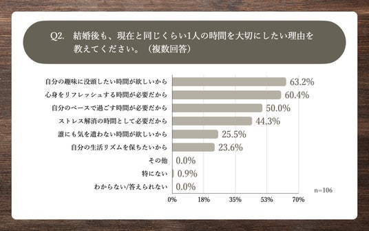 Q1で「非常にそう思う」「ややそう思う」と回答した方に、「Q2.結婚後も、現在と同じくらい1人の時間を大切にしたい理由を教えてください。(複数回答)」(n=106)と質問したところ、「自分の趣味に没頭したい時間が欲しいから」が63.2%、「心身をリフレッシュする時間が必要だから」が60.4%、「自分のペースで過ごす時間が必要だから」が50.0%という回答となりました。