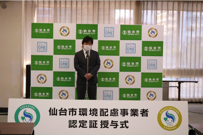仙台市環境配慮事業者認定委員会の矢吹真理子委員長は、「環境に配慮した事業活動に心より敬意を表したいと思います。当委員会は平成12年度に環境に配慮した小売店を認定するエコにこショップから始まり、制度開設から20年以上が経過しました。特に近年はSDGsやカーボンニュートラル等を背景として環境に関する関心が非常に高まっております。今回の認定を通じて皆様の優れた取り組みが他の事業者へと水平展開が図られ、環境配慮の輪が一層拡大していくことを期待しております」と認定事業者への敬意と今後の環境配慮の取り組みに期待を述べました。