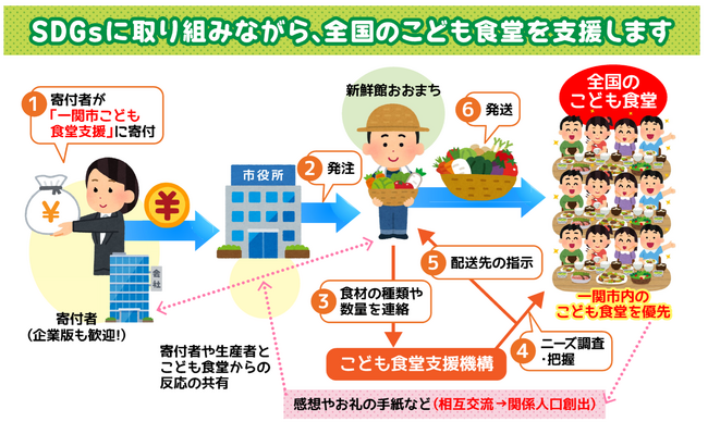 当時、市内でもすでにSDGsに取り組んでいる事業者さんはたくさんありました。こうした事業者さんをPRしていくことが課題の1つ目です。2つ目は、何かしらのSDGsの具体的な活動に対して、ふるさと納税を通じて形ある支援をすることです。これらの課題解決を模索していたタイミングで一般社団法人こども食堂機構(以下、「機構」)から連携のご提案をいただき、こども食堂を支援する寄付を立ち上げることになりました。これが一関市のふるさと納税の方向性を決定づけることになったのです。