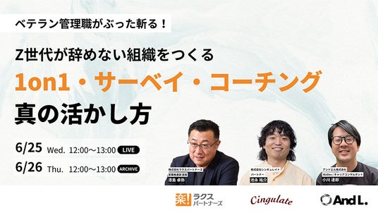 科学とデータの力で組織開発を支援する株式会社シンギュレイト(本社:東京都渋谷区、代表取締役:鹿内 学、以下シンギュレイト)は、株式会社ラクスパートナーズとアンドエル株式会社と共催で『ベテラン管理職がぶった斬る!~Z世代が辞めない組織をつくる「1on1・サーベイ・コーチング」真の活かし方~』を開催します。このセミナーは2025年6月25日(水)12:00~13:00でライブ配信、6月26日(木)12:00~13:00でアーカイブ配信されます。