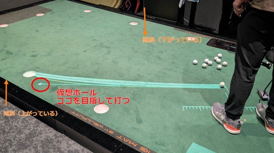 ガイドラインは、ホールまでの軌道や仮想ホール(傾斜による目標地点)、スタンスの位置などが投影されます。ガイドを表示したり、消したりしながら体に感覚を覚えさせていきます。