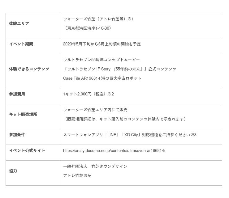 株式会社NTT QONOQ(以下、コノキュー)は、株式会社円谷プロダクション(以下、円谷プロ)が展開する『ウルトラセブン』55周年コンセプトムービー 「ウルトラセブン IF Story 『55年前の未来』」の世界観と連動する公式コンテンツとして、コノキューが提供する新感覚街あそびアプリ「XR City」(以下、XR City)を活用した体験型謎解きイベント『Case File AR196814 港の巨大宇宙ロボット』(以下、本イベント)を提供いたします。本イベントの開催は、2023年5月下旬から6月上旬を予定しており、体験エリアはウォーターズ竹芝(アトレ竹芝等)から開始し、順次拡大を準備中です。