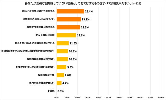 「なぜ、正確な回答をしていないのか」を聴取したところ、「同じような設問が続いて混乱する」26.4%、「回答画面の操作がわかりづらい」23.3%、「設問文や選択肢が長すぎる」22.5%と続きました。いずれも回答のしづらさを理由とするものとなっています。アンケートモニターは意図的に不正確な回答をしているのではなく、アンケート回答体験の中ですべて正確に回答することを諦めてしまっているのではないでしょうか。不正確な回答を減らすためにはアンケート回答体験を向上させるためのアンケート設問設計、回答画面が重要と考えられます。