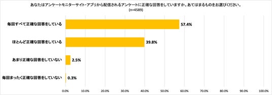 続いて、アンケートに正確に回答しているかを聴取したところ、「毎回すべて正確な回答をしている」が57.4%。「ほとんど正確な回答をしている」が39.8%と続きました。ほとんどのアンケート・モニターが「おおよそ正確な回答をしている」と言えます。