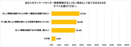 アンケートモニターとして登録している情報(年齢や居住地、職種など)が「一部は正しくない情報で登録している」「ほとんど・まったく正しくない情報で登録している」としたユーザーにその理由を聴取しました。最も多い回答は「正しい情報を登録することが怖い」37.2%。次いで「引っ越し等により情報が変わったが変更手続きをしていない」が33.2%、「正しい情報を登録するのが面倒、煩わしい」が31.4%と続き、3つそれぞれの割合に大きな差がありませんでした。また自由回答にも「正しい情報を登録することで個人を特定できてしまう」ことへの懸念が目立ちました。