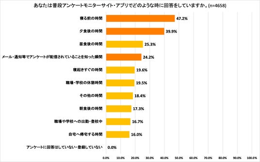 普段よりアンケートモニタサイト・アプリでポイ活をしているユーザーにどのような時にアンケート回答をしているかを確認したところ、「寝る前の時間」47.2%と最も多く、次いで「夕食後の時間」39.9%という回答となっていました。自宅でくつろいでいる時間帯にアンケートに協力していることがうかがい知れます。スキマ時間を縫ってアンケート協力しているのではなく、ある程度まとまった時間がつくれるタイミングでアンケートポイ活を行っているモニターが多いのではないでしょうか。