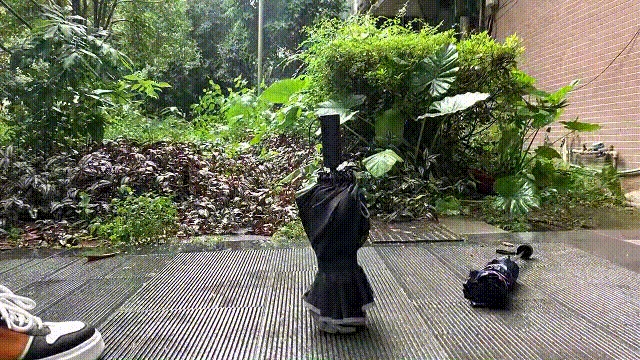 この傘は16本の傘骨が傘の表面にぴったりフィットするのでそのまま地面に自立させることができます。濡れた傘を少し置いて両手でスマホを使いたい時、電車やバスの床に少し置きたい時、コンビニに入る時、地面にそのまま置けるのはとっても便利です。